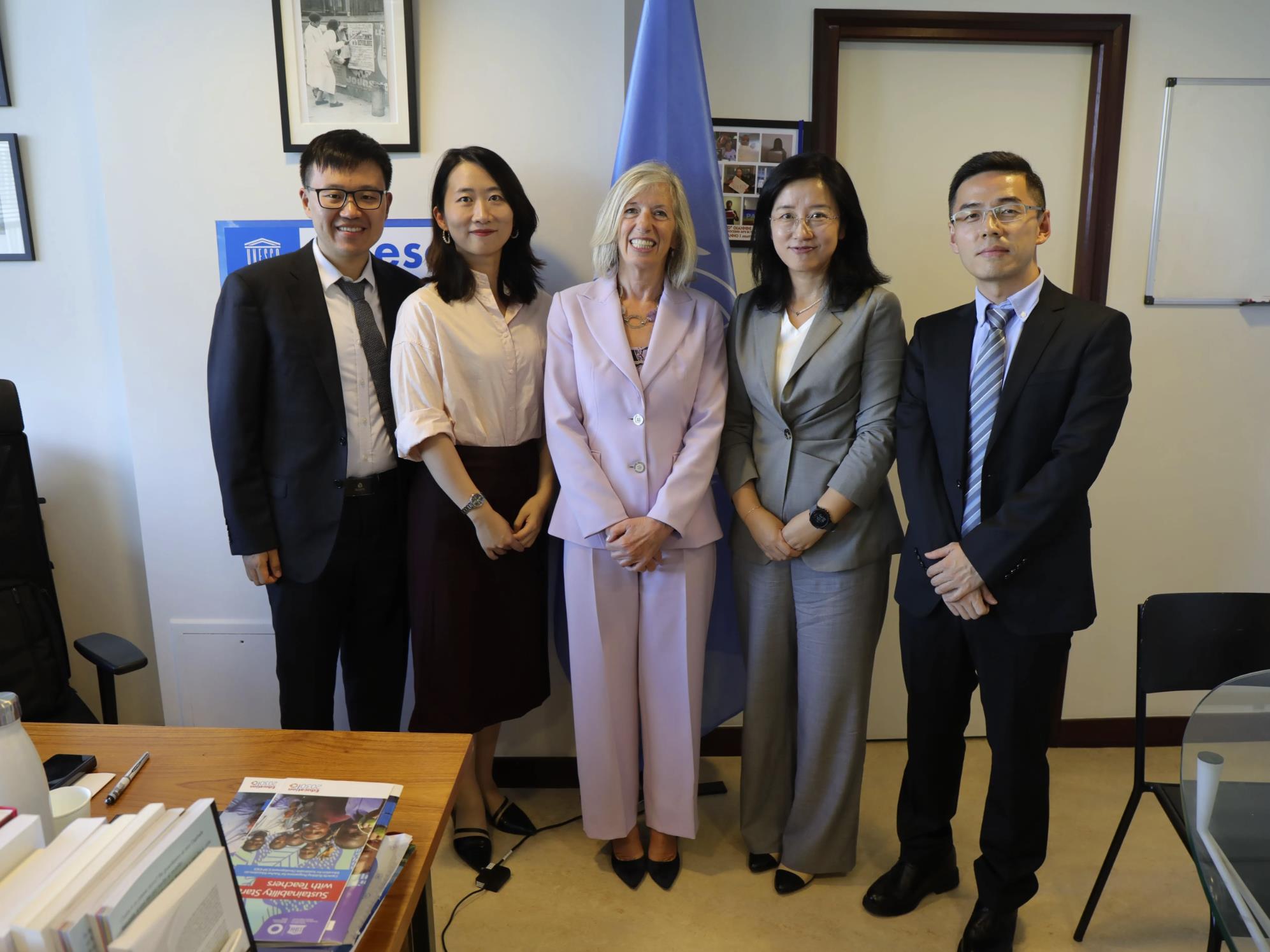 联合国教科文组织与好未来相关负责人合影(从左至右:好未来AI算法负责人刘子韬博士、好未来教育研究院院长汤学黎、联合国教科文组织教育助理总干事斯蒂芬妮亚·贾尼尼、好未来执行总裁位晨、好未来CTO田密)